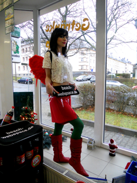 Die Kuenstlerin verkleidet die Living dolls passend zum Geschaeft.